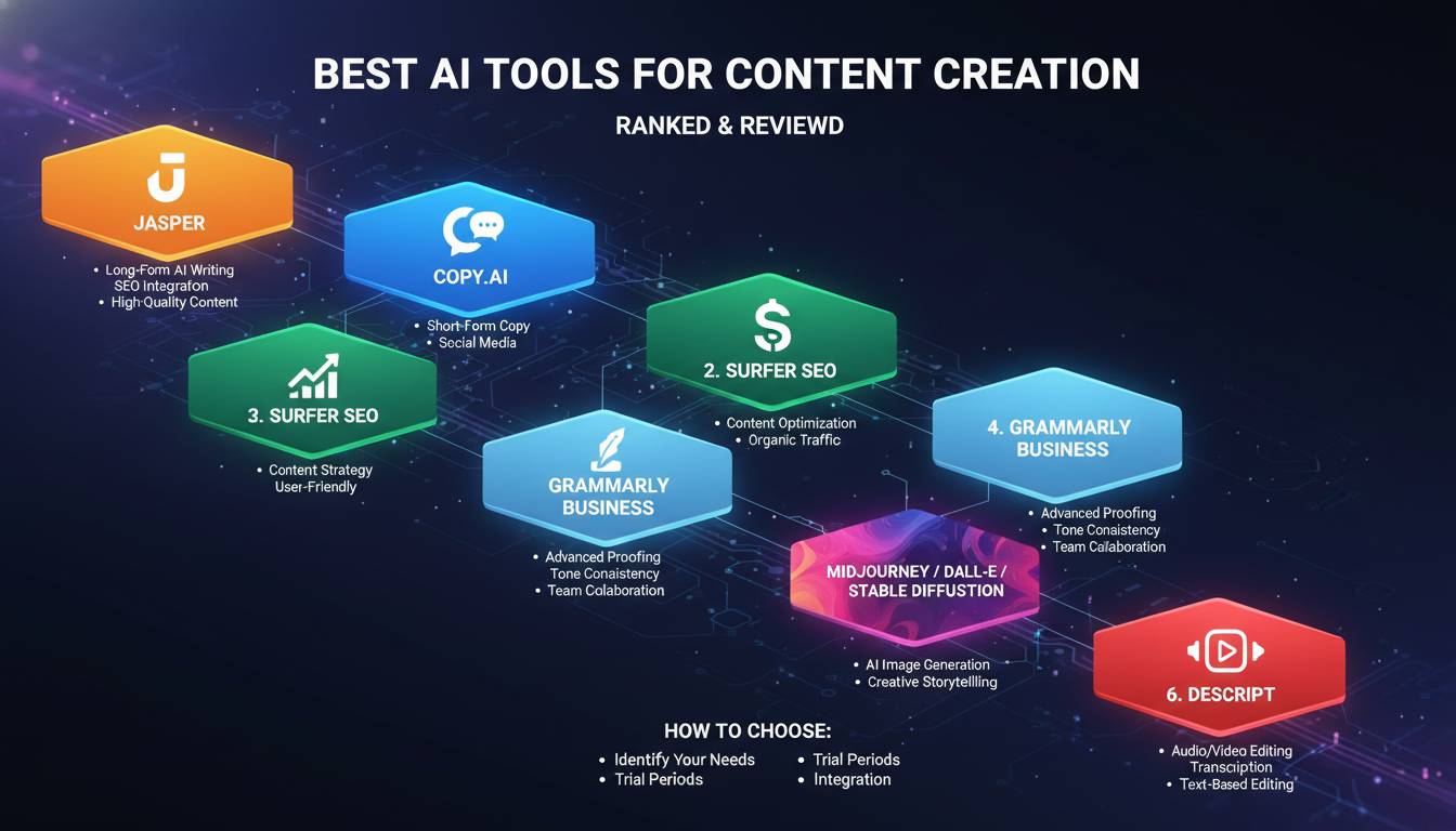 For general writing help, ChatGPT and Claude cover most bases. Visual work? Midjourney and Runway lead. Audio? Descript and Murf deliver. SEO focus? Surfer SEO and Grammarly earn a spot.